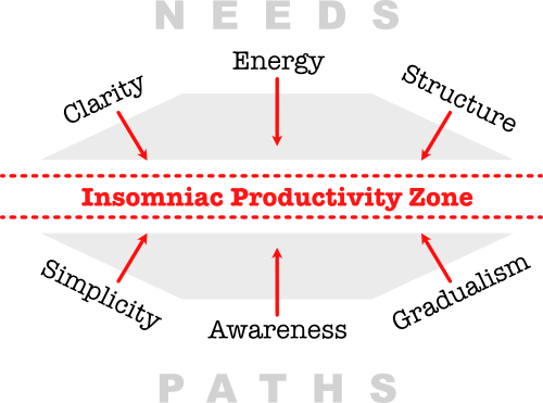 But working with your existing insomnia is the overarching point behind The Insomniac’s Guide to Productivity. Yes, if you can, the best way to improved productivity and health is improved sleep. Absolutely. But if you can’t (hopefully on a short-term basis)…give the tools and techniques in the book — all of them simple — a try.